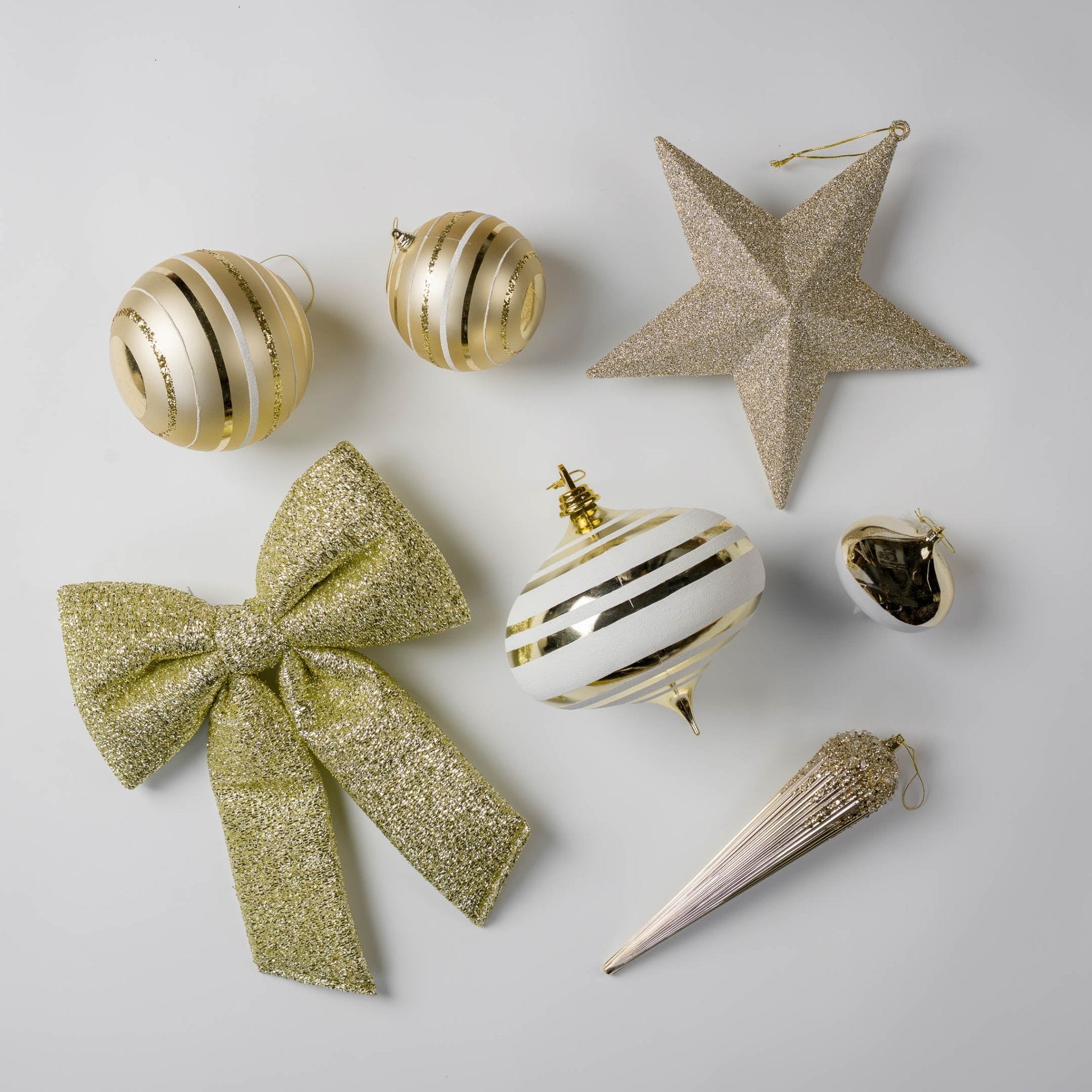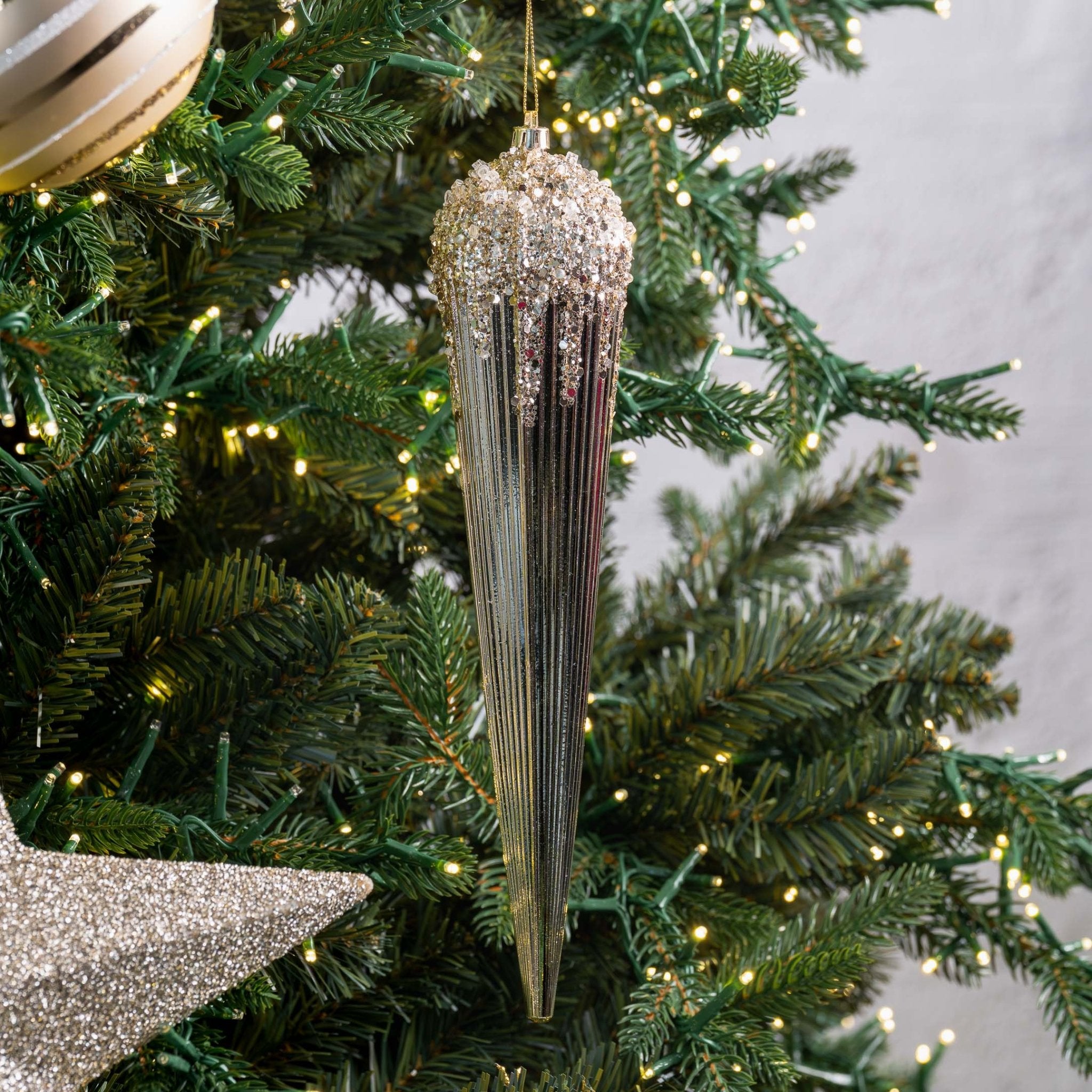 Its elongated teardrop shape features a soft champagne and white finish, accented with glitter and sequins for a dazzling effect—perfect for trees, wreaths, or garlands.