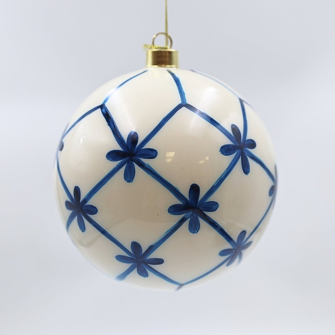 Meet your new favorite ornament. This elegant white and blue glass ball dazzles with East Coast charm and a hand-painted floral navy design. Its frosty palette evokes snowy strolls and cozy Nancy Meyers Christmas vibes. Sophisticated and versatile, it shines on trees, garlands, or wreaths. Love timeless style? Add Joy By to your holiday collection and let your festive dreams take center stage.