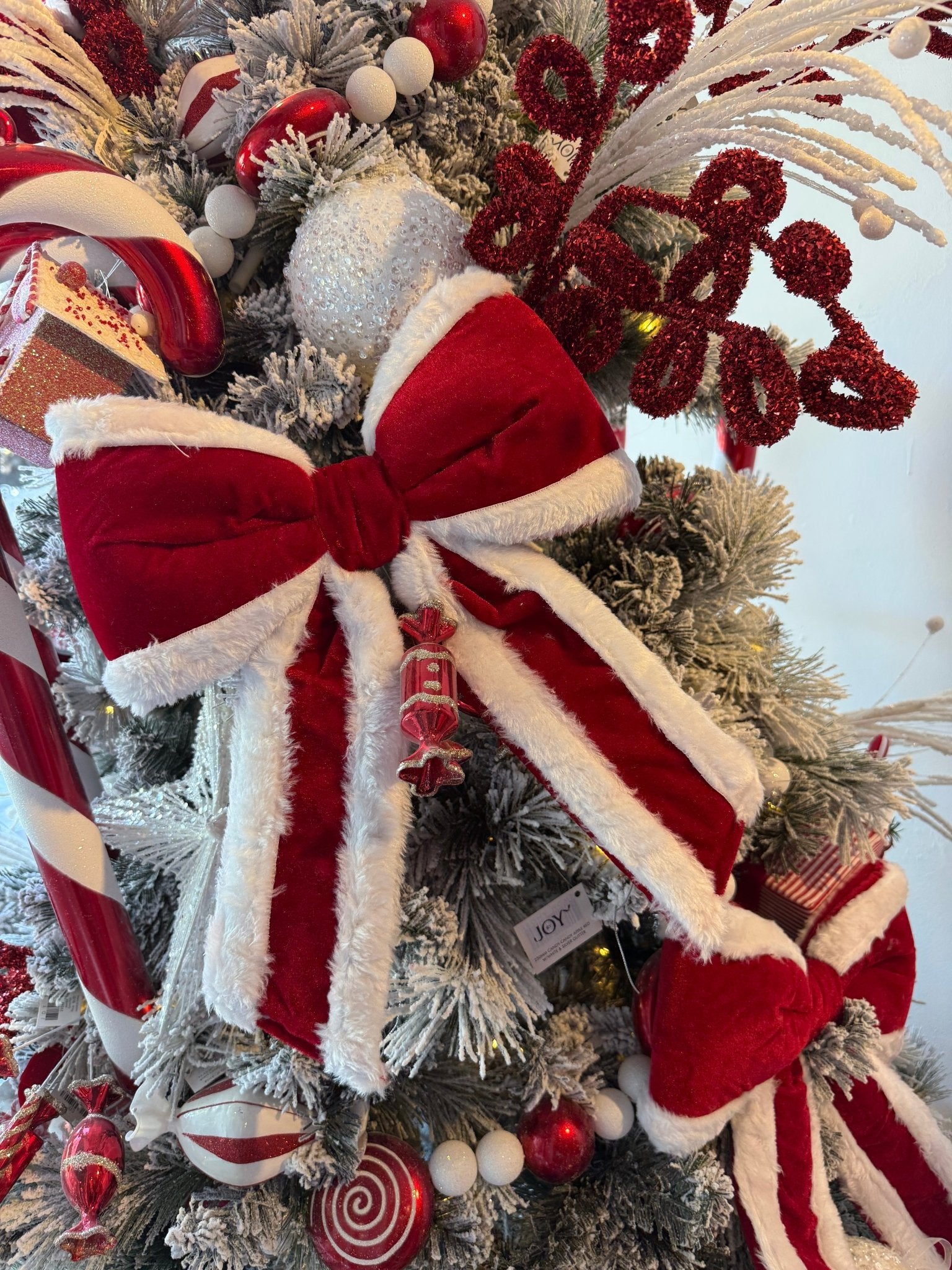 Add a bold, festive flourish to your holiday décor with this plush red and white bow, beautifully finished in soft faux fur.