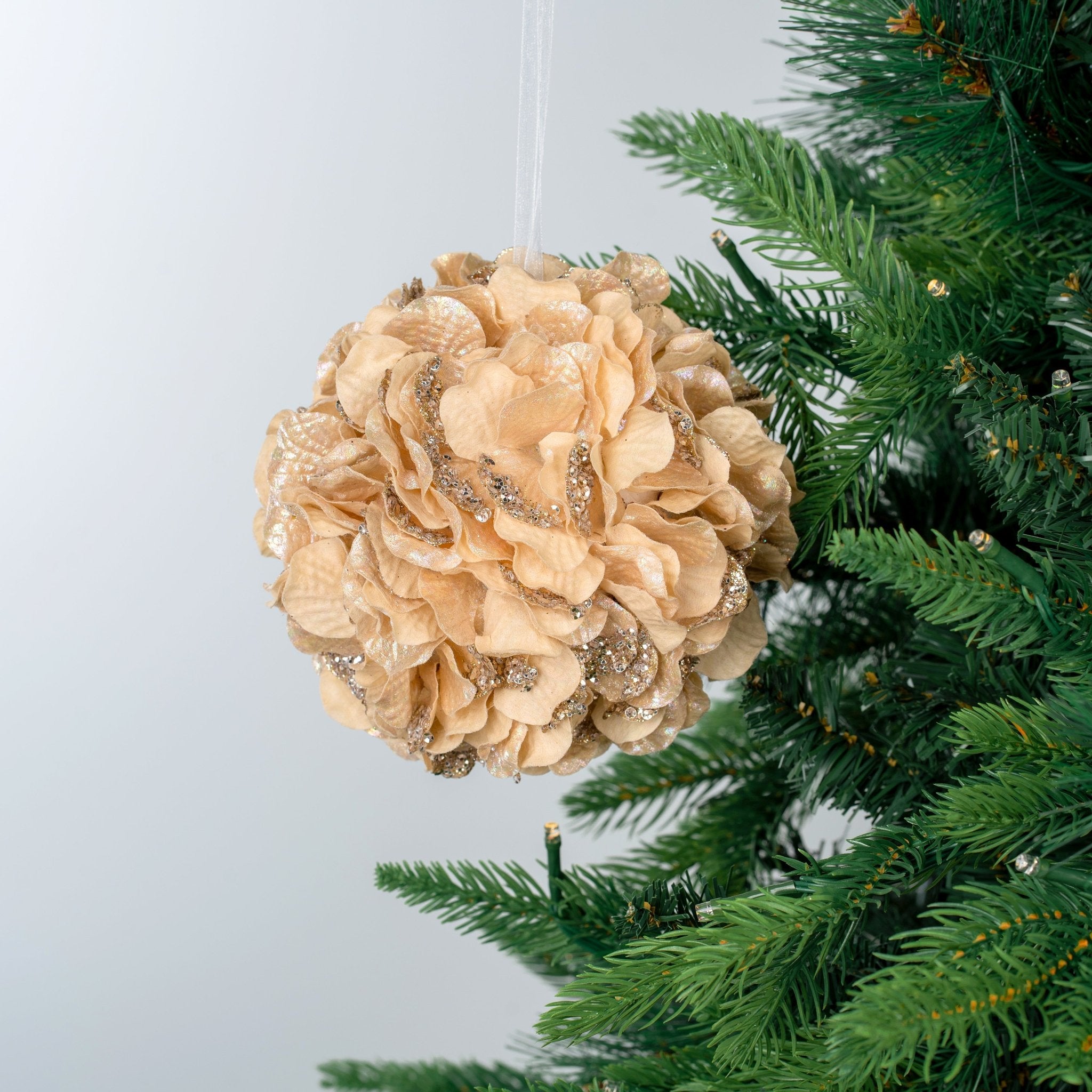 Enrich your holiday décor with our Yellow Gold Festive Hydrangea Ornament. Its golden brilliance and intricate detail bring a touch of refined charm. Perfect for adorning your tree or centerpiece, infusing your celebrations with sophistication and festive splendor.