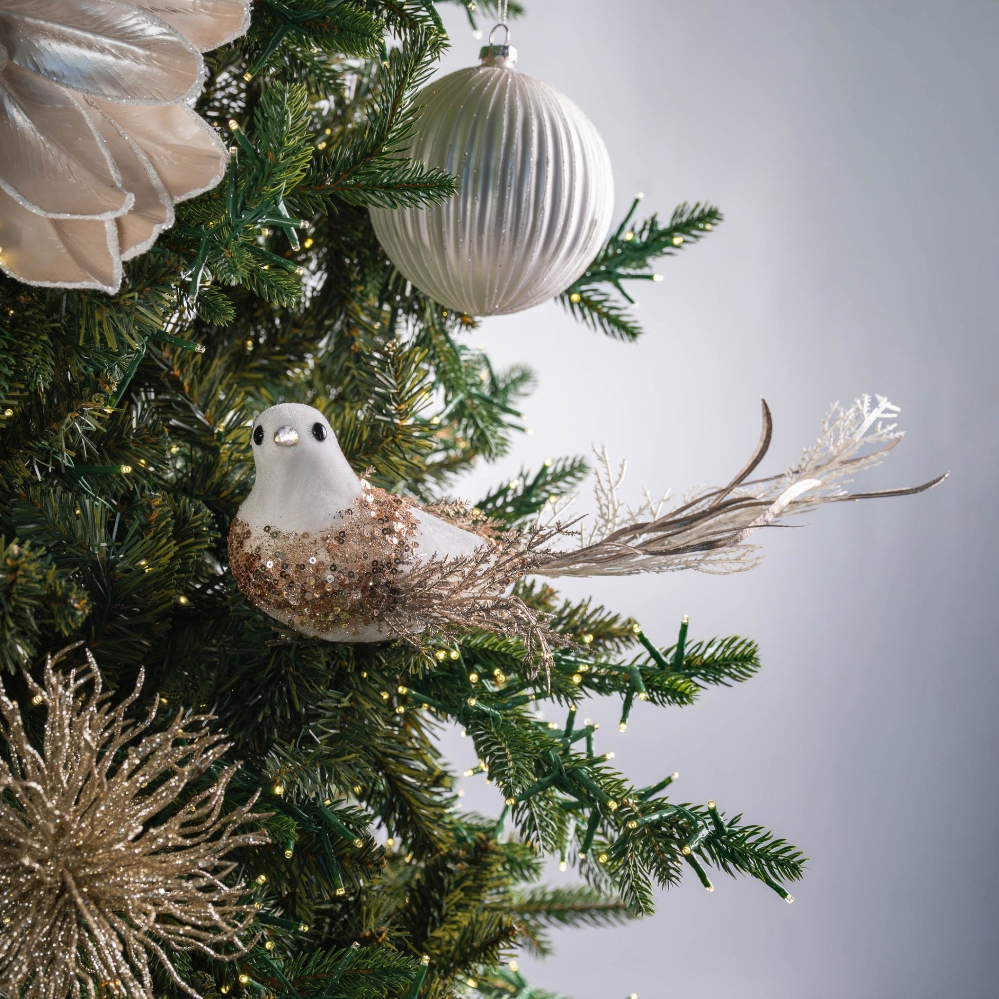 Grace your tree with the serene charm of this white bird ornament, delicately accented with champagne-toned details. Its gentle presence brings a whisper of elegance to any festive setting.