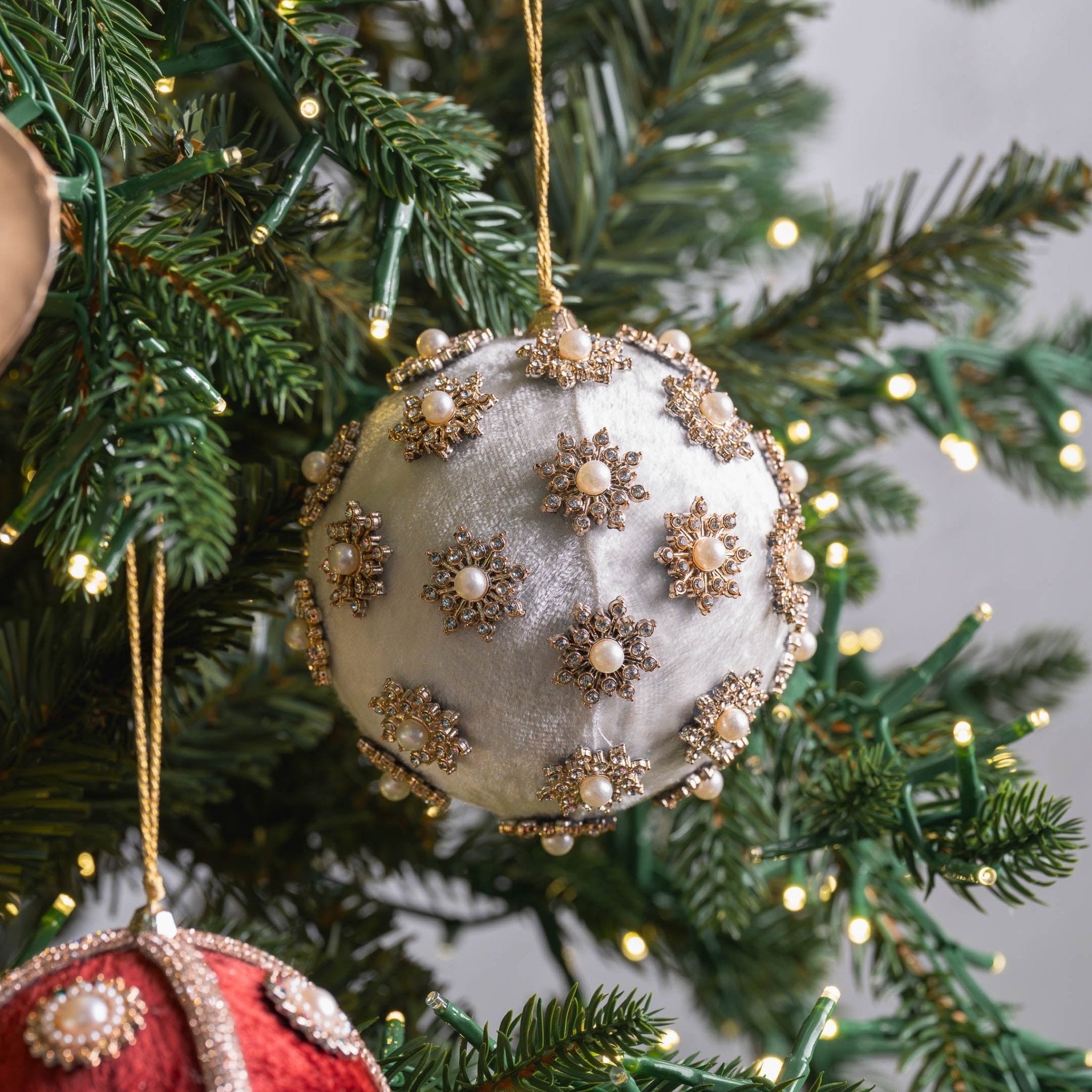Elevate your tree with this soft cream velvet ornament, beautifully accented with delicate snowflake studs.