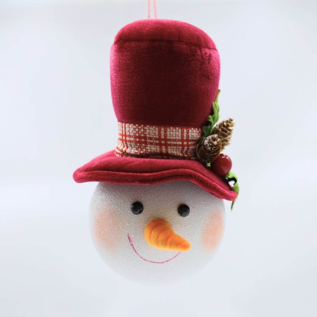 Bring a frosty smile to your holiday décor with this charming snowman head ornament, topped with a burgundy hat and festive holly.