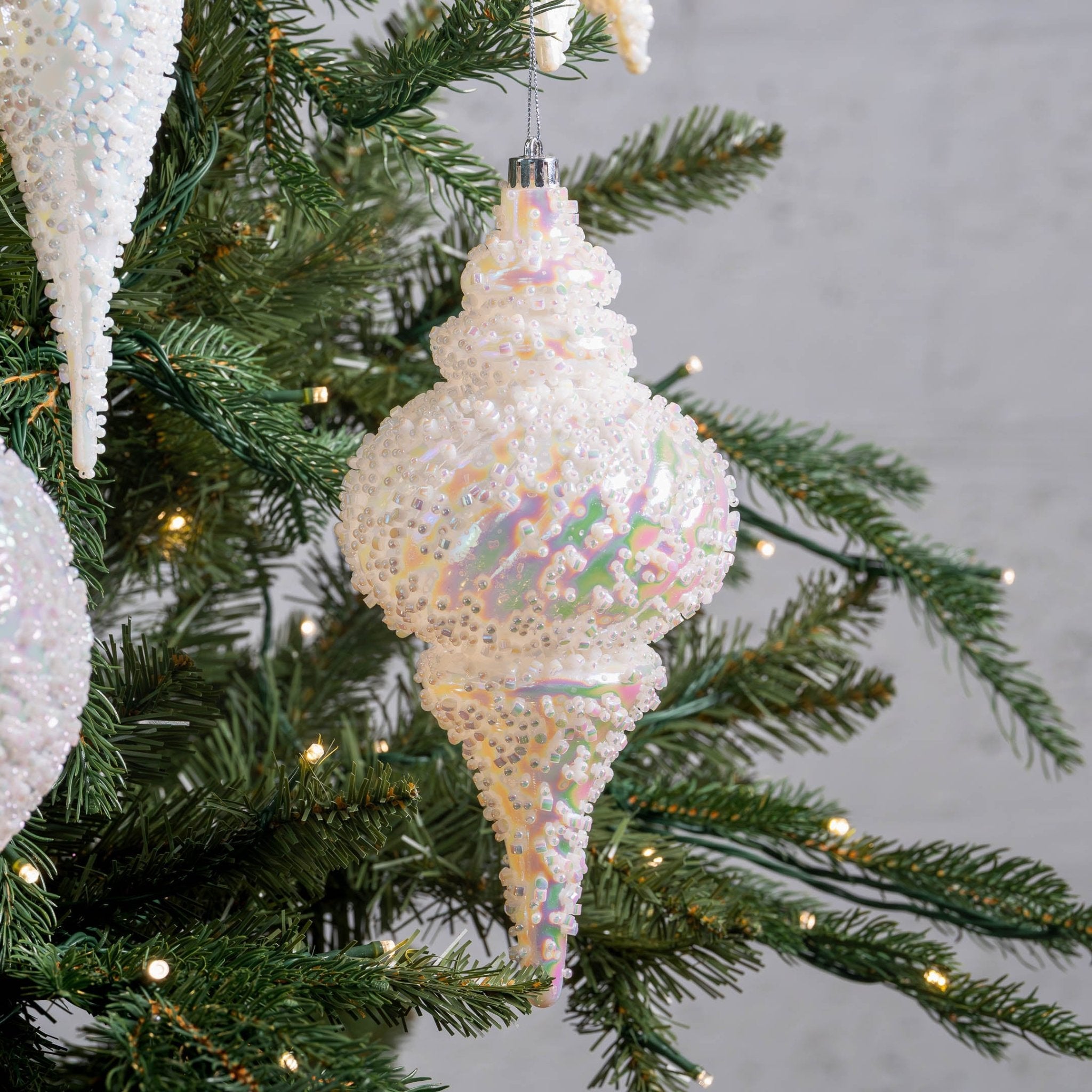 Its graceful finial shape, paired with a luminous iridescent finish and delicate bead accents, makes it a perfect statement piece for trees, mantels, or tabletop displays.