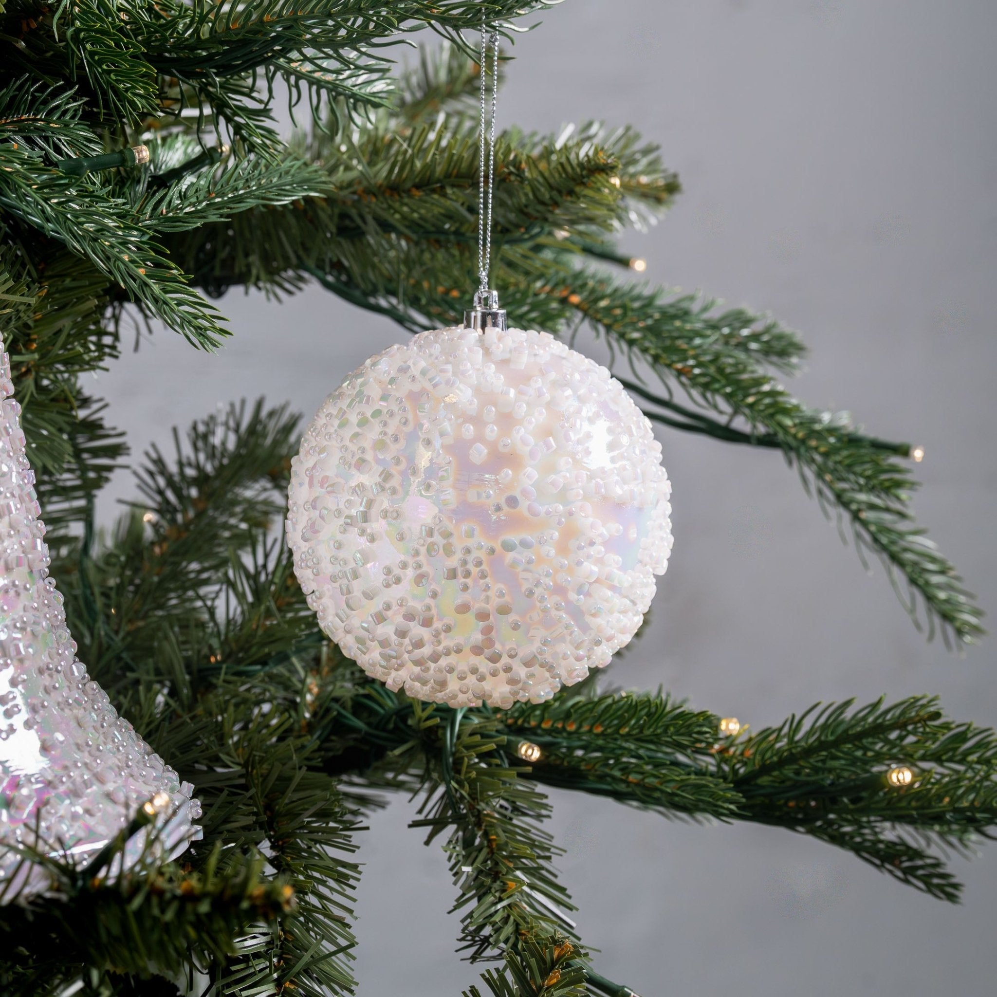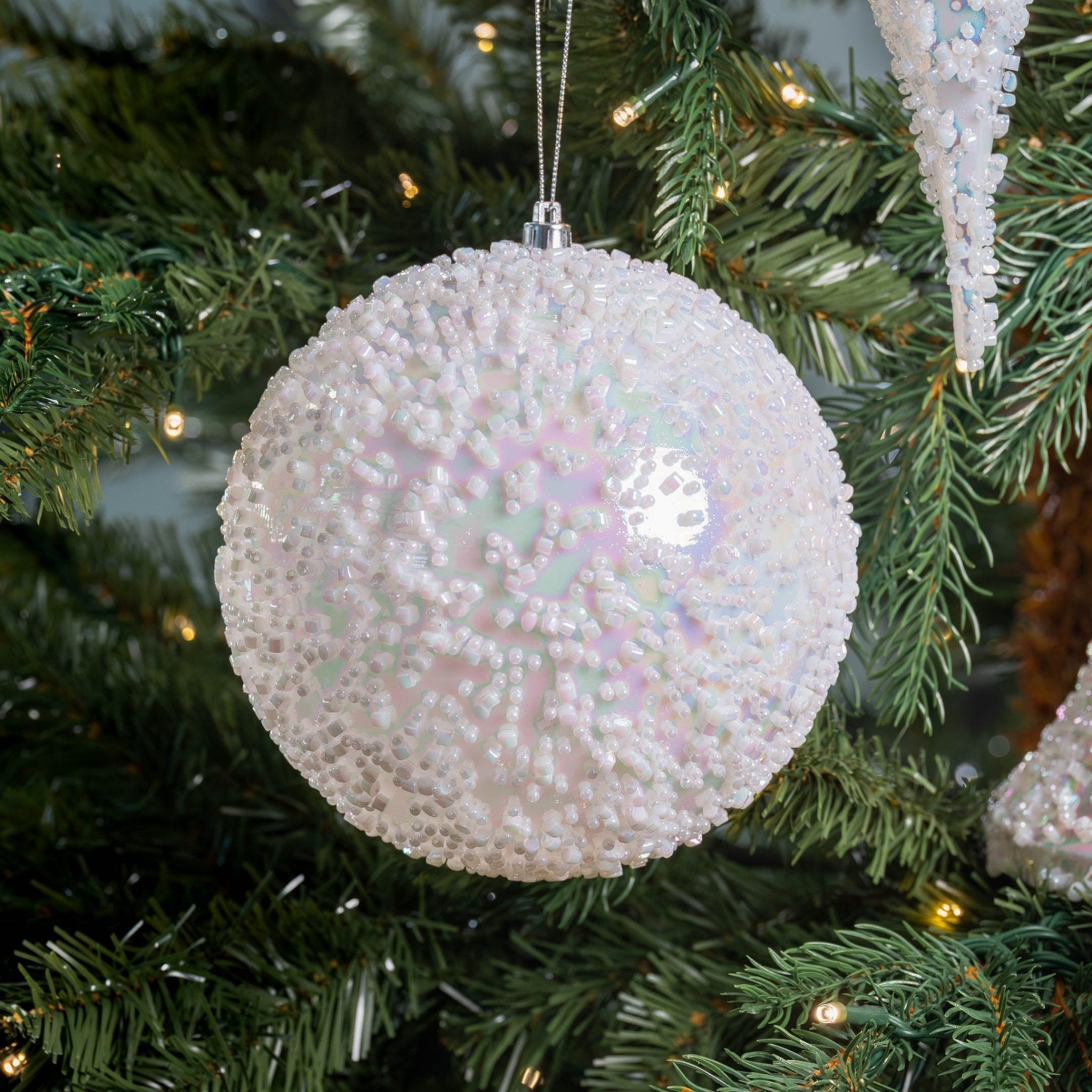 Sparkling and versatile, this clear iridescent ball ornament adds a touch of luminous charm to your holiday décor.