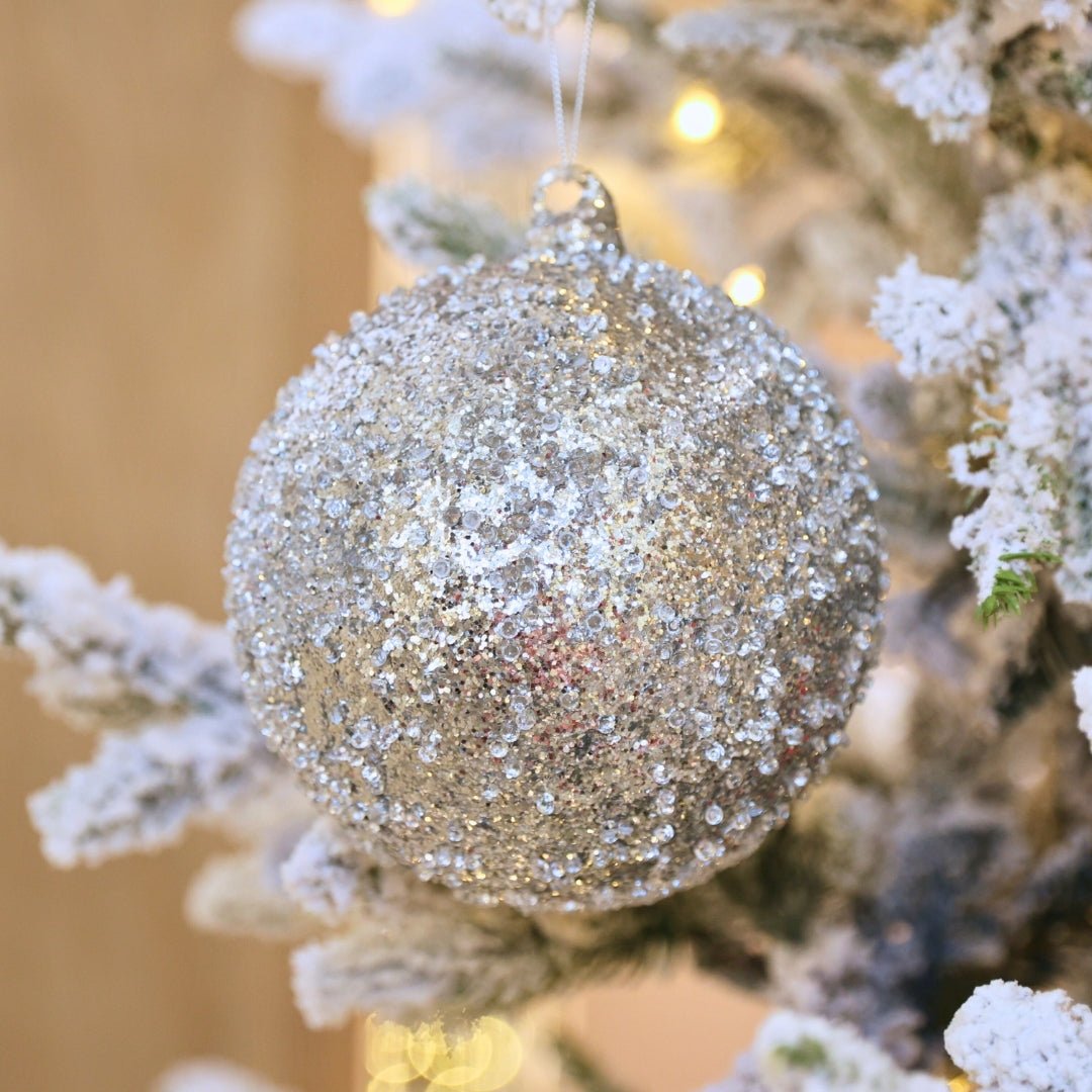 Covered in tiny, glistening beads that catch the light beautifully, this ornament exudes luxury and texture. The radiant silver tone blends effortlessly with both classic and contemporary décor, while its handcrafted detail creates a magical, snow-dusted finish.