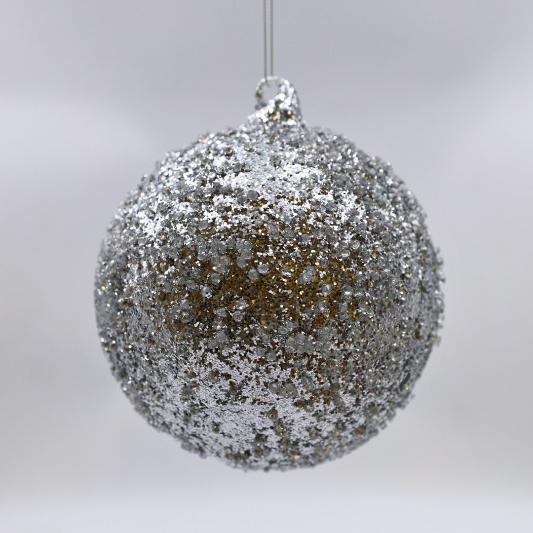 Elevate your holiday tree with the charm of our Silver Sugarbead Glass Ball Ornament - a sparkling masterpiece that adds elegance to any festive display.
